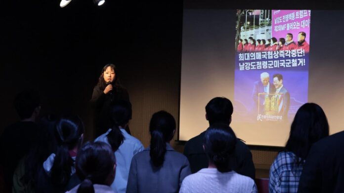 It began with a lecture by charge d’affaires of the Embassy of the Bolivarian Republic of Venezuela in South Korea. She demanded an end to the blockade against the Venezuelan people, the US military threats, and the immediate cessation of US attacks. She said “The truth about Venezuela is not a mere slogan. These threats, which have persisted for the past 26 years, are now being minimized and concealed within the blockade that the US and its satellite states are imposing in the Caribbean under the pretext of the ‘war on drugs.’”